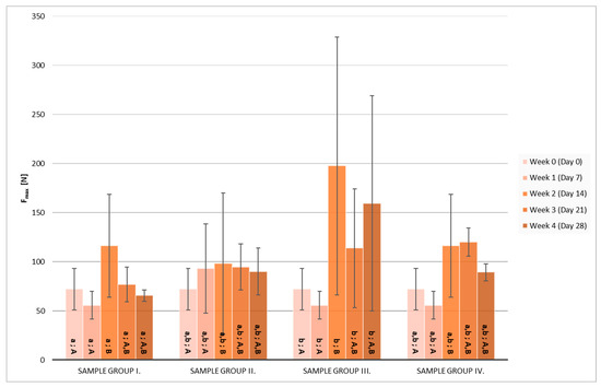 Fmax[N] results of different sample groups (I., II., III., IV.) at each measurement day (0, 7, 14, 21, 28) (lowercase Latin letters indicate significant differences according to sample groups and uppercase Latin letters indicate significant differences according to storage time).