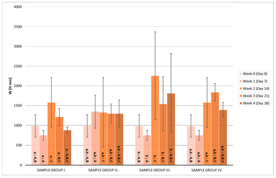 W [N mm] results of different sample groups (I., II., III., IV.) at each measurement day (0, 7, 14, 21, 28) (lowercase Latin letters indicate significant differences according to sample groups and uppercase Latin letters indicate significant differences according to storage time).