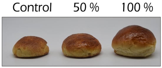 The dough was allowed to rest and ferment for one hour at 30 °C. It was then divided into 80-g portions and left to ferment for another hour. The dough portions were brushed with eggs, as is typical, and baked at 180 °C using a conventional oven (BOSCH OVEN MODEL HBA574ES3, Gerlingen, Germany). Samples intended for sensory evaluation were baked for 12 min, vacuum-packed, and frozen until evaluation. Samples for other analyses were baked for 15 min, and tests were conducted the same day. Figure 1 shows the external appearance of the control brioche and the reformulated samples.