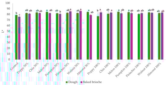 The lightness (L*) of the doughs and brioche breads baked with the total and partial substitution of butter by vegetable oils. Significant differences between samples are indicated by different letters: the letters in the green columns refer to the dough, while the letters in the purple columns refer to the baked brioche. Different letters within each column indicate statistically significant differences (p < 0.05).