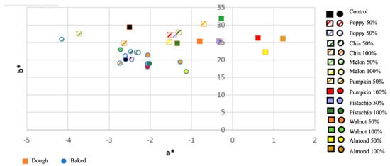 Figure 3 shows the results for parameters a* and b*. The doughs present much more dispersed values compared to the baked breads, whose values, in most cases, are similar to those of the traditional sample. The differences existing in the doughs can be related to the results for the colors of the oils due to the presence of pigments such as carotenes, chlorophylls, and xanthophylls. These pigments are responsible for the yellow, green, and orange hues often observed in oils from sources such as pumpkin []. During baking, the Maillard reaction influences the color parameters a* and b*, contributing to the golden-brown tone characteristic of baked products, but it varies depending on factors such as the temperature, pH, type of sugars, and amino acids present [].