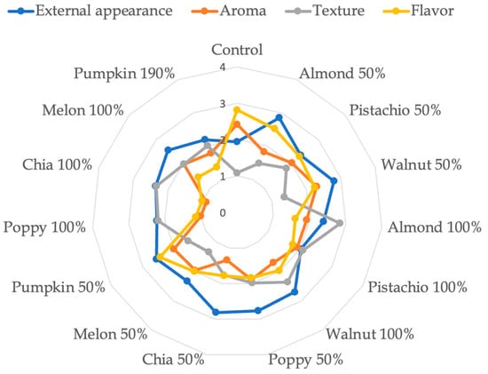 The same applies to flavor, where butter provides these types of bread with a unique taste, leading consumers to rate the traditional sample higher. Additionally, the type of oil affects the acceptability of flavor and aroma, and thus, when chia and poppy seed oils are used, consumers tend to give lower ratings. Both chia and poppy seeds are known for their characteristic flavors, which can range from nutty to slightly earthy or even bitter, and they are strongly linked to their lipidic profiles (Omega-3). These flavors can interfere with the typical sweet and delicate profile of brioche bread. Studies have shown that consumers often prefer more neutral oils as they do not overpower the other ingredients [].