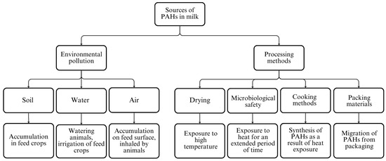 The lipophilicity of PAHs results in their accumulation in fat-rich food products. Milk and dairy products can be included in this group. Due to their high nutritional value, they are consumed by children and people in later adulthood worldwide as a dietary staple. Nutrition experts recommend the consumption of dairy products every day to anyone who can tolerate them [37,51]. The presence of PAHs in milk and dairy products primarily stems from the environmental contamination of feed, water, and grass, as well as the high-temperature processing methods applied to milk [37,40] (Figure 1).