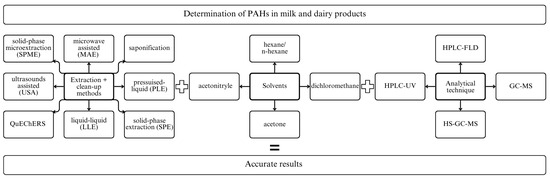 Beyond the fat release step, selecting appropriate solvents for extracting fat from milk is essential. This choice depends on the polar and non-polar nature of the matrix and PAH molecules, as well as the extraction method and chromatographic techniques employed (HPLC or GC) [71]. The following section discusses the parameters of methods used for analyzing milk and dairy products in greater detail.