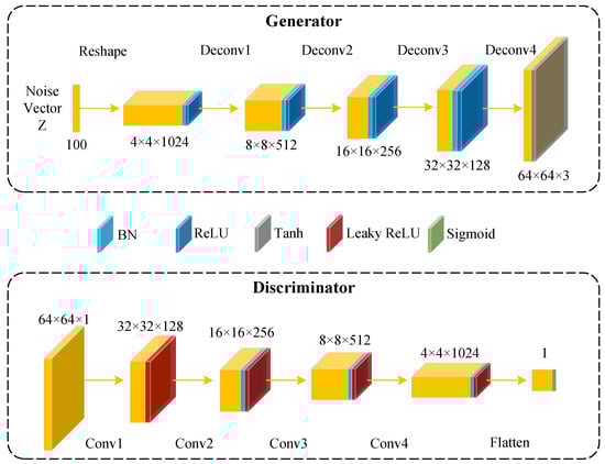 However, GANs can be unstable during training, leading to instances where the generator produces invalid outputs. A DCGAN [26] shares the same goal as traditional GANs. The primary distinction lies in the fact that a DCGAN utilizes multiple convolutional blocks to construct its generator and discriminator. Specifically, the generator employs a deconvolutional architecture, while the discriminator employs a convolutional architecture. The structures of the generator and discriminator of the DCGAN are illustrated in Figure 3.
