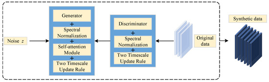 The main structure of the proposed SAITI-DCGAN approach can be summarized as follows. A self-attention module is integrated into the generator, and spectral normalization is adopted for both the generator and discriminator. In addition, the two time-scale update rule is applied to both the generator and discriminator, utilizing distinct learning rates. The general framework of the proposed approach is depicted in Figure 4.
