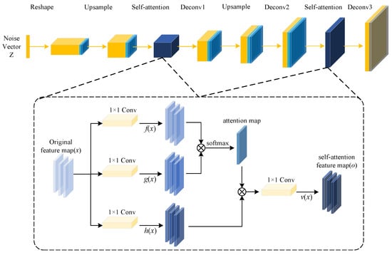 The traditional DCGAN generates high-quality and intricate features by utilizing fixed spatial local information within an image, exhibiting remarkable performance for texture features. Nevertheless, capturing specific geometric features remains challenging [37]. To address this issue, a self-attention mechanism is introduced into the DCGAN framework in this work. During the image generation process, the generator coordinates fine details from each position with distant parts of the image, allowing it to disregard irrelevant information and enhance the significance of key feature details. This combination of the attention mechanism is applied to the middle layer of the generator, enabling it to effectively extract local image features and enhance the generation diversity. The network structure of the self-attention module is illustrated in Figure 5.