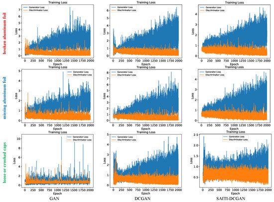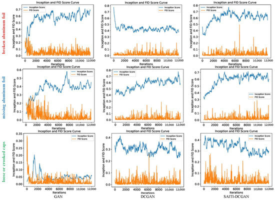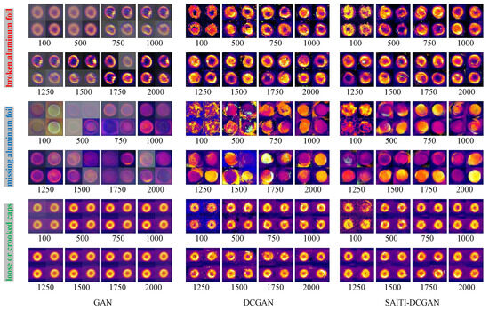 Images generated by the GAN, DCGAN, and our SAITI-DCGAN approach are illustrated in Figure 7. In the left-most column, various types of infrared thermal images of aluminum foil sealing are displayed. Specifically, it includes images of broken aluminum foil within the bottle cap (BAF), images that depict the absence of aluminum foil in the bottle cap (MAF), and images showcasing instances where the bottle cap was either inadequately tightened or skewed during the tightening process (LCC). The final row presents the generation outcomes obtained from the GAN, DCGAN, and our proposed SAITI-DCGAN approach. Given the large number of test samples, for each type of defect generation, the input used for comparison in Figure 7 was randomly selected from the normal samples in the test set. All samples were rigorously screened and classified under the guidance of domain experts, ensuring that they not only accurately reflected both normal and abnormal conditions in real-world application scenarios but also maintained internal consistency within each category of images. Consequently, even randomly selected samples, particularly the normal samples, possessed characteristics that were representative of their respective categories. Furthermore, to ensure the fairness and directness of the model output comparisons, all tests were conducted at the same iteration stage on identical inputs. This meant that the different network architectures faced exactly the same input conditions at the same training stage, thereby making the comparison of output results more equitable and comparable. The results shown are the outputs of the networks at different iteration stages for the same input. Further analysis of these results will be provided based on the subsequent experimental findings.