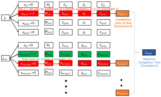 - Constraint-1: Each task can only be executed in specific workplaces. aij is a binary variable indicating if task Ji can be executed in workplace Wj (1 if possible, 0 if not possible):