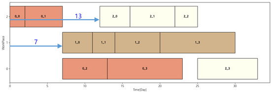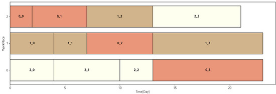 First, we explain the experimental results with small examples, since real-world cases are difficult to use for demonstration. Figure 2 and Figure 3 show the scheduling results without and with start days constraints, respectively. The numbers in each box represent {Task ID}_{SubTask ID} and the numbers above an arrow show the start day constraints. The horizontal axis shows the timeline in days, and the vertical axis represents the three workplaces (0~2). The color coding or shading differentiate the tasks to help visualize how tasks are distributed across workplaces over time.