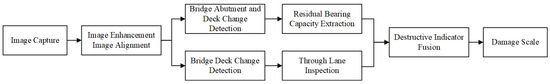 After using the UAV to take visible-light images, damage analysis of the bridge structure is carried out to identify the bridge pier and bridge deck, and the strike crater is simplified to a circle for the convenience of the analysis. Based on the above analysis, the abutments play the role of support and force transmission in the bridge structure, so the impact of the abutment damage on the bridge is primarily reflected in the change of bearing capacity, and the bridge deck mainly provides the passageway and transmits the load, so the impact of the bridge deck damage on the bridge is mainly reflected in the change of the path of the passageway and the remaining bearing capacity. At the same time, for the bridge blow, there may be penetration and loss of quality in two types of conditions and different conditions on the components of different impacts. The same location and size will also lead to the advantages and disadvantages of the state of the damage, so we need to distinguish between the different states and the assessment and then calculate the comprehensive results; the flowchart of the method is shown in Figure 1.