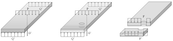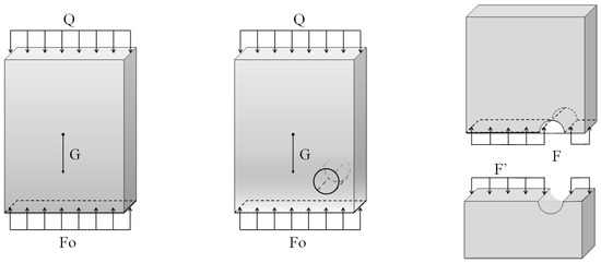 Since the abutment is a vertical structure, F is the combined force of the ground support force Fo, the abutment self-weight is G, and the bridge deck transfer load is Q. The force is manifested as pressure, and A is the horizontal cross-sectional area of the abutment. When the beam structure is complete, due to the existence of self-weight, in any transverse cross-section of stress with the height of the decrease and increase, when the abutment structure is missing, the missing part of the cross-sectional area decreases and will be in the missing part of the stress concentration. Therefore, the size of the residual bearing capacity of the bridge abutment is negatively correlated with the height of the strike location and positively correlated with the strike intensity, and the simplified force situation is shown in Figure 2.