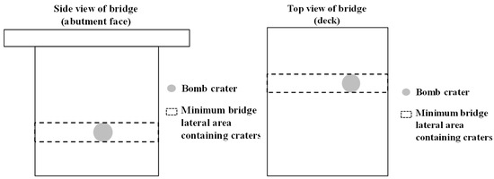 - For the screened damaged area, the relative damaged area ratio is calculated, which is defined as the ratio of the area of the damaged area (crater) to the area of the smallest bridge lateral area containing the damaged area, as shown in Figure 4. When the relative damage area ratio exceeds 50%, the crater area is too large, and the bridge may collapse directly, which divides the relative damage area ratio into 0–0.05, 0.05–0.1, 0.1–0.15, 0.15–0.2, 0.2–0.25, 0.25–0.3, 0.3–0.35, 0.35–0.4, 0.4–0.45, and 0.45–0.5. The ten intervals correspond to residual bearing capacity classes 1–10, respectively.