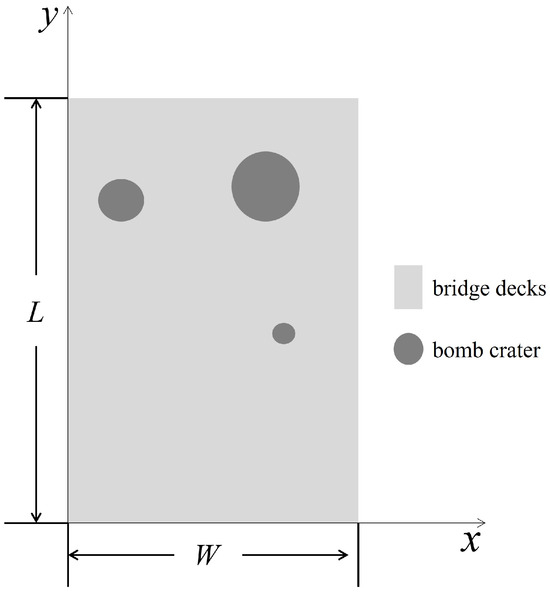 Figure 5. Simplified diagram of bridge deck. - Combine the bridge deck change detection results to generate the crater location matrix and the diameter matrix of the crater, where the order in the sample crater location matrix is sorted from smallest to largest according to the size of the x-coordinate; is the x-coordinate, is the y-coordinate, M is the number of craters, and is the diameter of the ith crater. Calculate the distance between the centers of any two craters and form the distance square matrix D, where the elements of the square matrix can be calculated by the following equation: