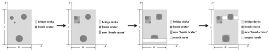 - Read the new crater position matrix and the diameter matrix . If , set the width of the retrieval bar to be min and the length of the retrieval bar to be the width of the bridge deck and the retrieval bar to be rendered in white. Start from the bottom of the area, perform the “and” operation of the retrieval bar with the bridge deck, delete the white areas whose widths are smaller than the width of the retrieval bar, and calculate the sum of downward integer values of the length of the white areas divided by the width of the vehicle after the operation. Calculate the length of each white area after the operation divided by the width of the vehicle W’ and the downward integer value of OP. After retrieving this area, record the information of this crater and the minimum value of its OP; if , set the width of the retrieval bar to , and the rest of the operation is the same as above. Finally, compare the OP values and output the minimum value and its crater information.