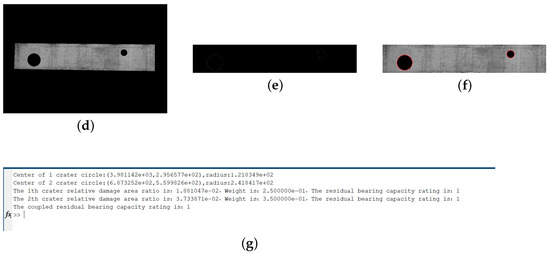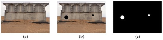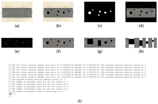 Images of bridge abutments and bridge decks were captured using a DJI Mavic 3 Cine drone equipped with a 20-megapixel 4/3-inch CMOS imaging system. In order to simulate the damage state of the bridge under munitions strikes, MATLAB R2014a was used to generate strike craters with random locations and sizes. In the experiment, the dimensions of the bridge were 30 m long and 12 m wide, and the height of the abutment was 3 m. Based on the lane width of 3.6 m, the number of original passable lanes of the bridge is calculated to be three. Penetrating strikes are simulated by randomly laying black circles of varying numbers, sizes, and locations on the bridge deck and abutments. The experimental process and results are shown in Figure 7 and Figure 8.