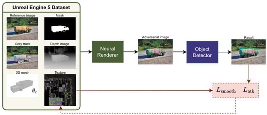The texture optimization is illustrated in Figure 1. Let be the dataset, where the elements represent the following for each sample, respectively: a reference photorealistic image, a gray-textured truck image, a depth map, a binary mask, and camera parameters. Our objective was to find the adversarial texture that minimized the detection confidence scores produced by the detection model F: