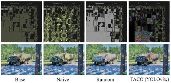 The standard textures (Figure 2) were applied to the truck model and evaluated on the YOLOv8 model family (Table 2). In addition to these baseline textures, the figure also include a TACO-optimized camouflage texture, which was trained on the YOLOv8x model. Larger YOLOv8 models exhibited higher detection performance on these baseline textures.