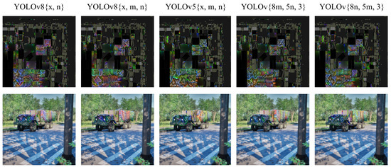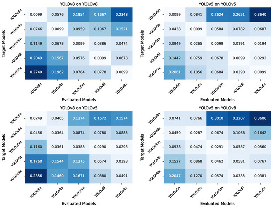 We explored how adversarial textures optimized on models of different sizes transferred across the YOLOv8 and YOLOv5 families, which include nano (n), small (s), medium (m), large (l), and extra-large (x) variants. Textures were optimized using individual models and then evaluated across all sizes within the same family and across the other family. Figure 3 illustrates the AP@0.5 results in a grid map, where each row represents a texture trained on a specific source model, and each column represents the target model on which the texture was evaluated.