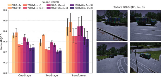 Figure 6 provides a bar chart summarizing the average AP@0.5 scores for each texture across these model categories. Our findings showed that optimizing adversarial textures on a combination of models from different architectures and sizes yielded the best transferability. Specifically, the texture optimized on the combination of YOLOv8n, YOLOv5m, and YOLOv3 achieved the lowest average AP@0.5 of 0.0972 across all tested models. This is more than 0.11 less than single-model textures (0.1148 less than YOLOv8n and 0.1480 less than YOLOv8x).