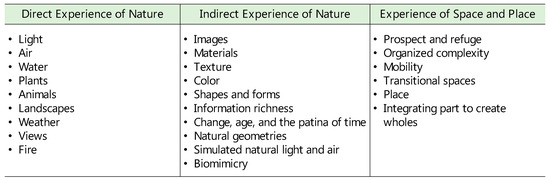 Direct experience of nature involves interaction with nature’s characteristics and functions. Early biophilic design focused solely on aspects of nature that were free from human intervention [22]. However, recently, artificial nature that activates ecosystem functions has also been considered a direct experience. This results from pursuing environmentally sustainable development by maximizing nature’s functional benefits [21]. Indirect experiences with nature involve mimicry of nature rather than direct exposure. This includes intentional works such as natural materials and colors that evoke a sense of nature. In addition, this includes exposure to nature through photos and videos; therefore, virtual simulations could be considered to optimize these experiences. Finally, people experience space and place by being exposed to built environments that exhibit the characteristics of the natural context. The experience of space and place draws involuntary attention from humans [23], including spatial properties that arouse human curiosity and interest, such as prospect, refuge, mobility, and wayfinding.