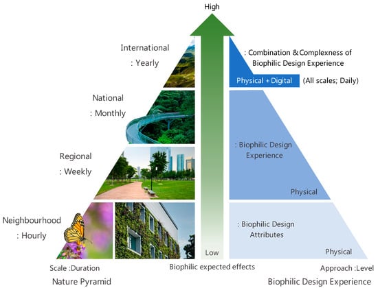Beatley [24] suggested the Nature Pyramid to experience optimal nature, depending on the environmental scales. The Nature Pyramid is a guideline for discussing the duration and intensities of nature that are essential for human health. At the top level of the Nature Pyramid, the international scale guarantees high immersion and value, but is not easily accessible. Especially for seniors, it is vital to ensure more significant opportunities to experience nature. Therefore, we must discuss efficient ways to experience high-quality biophilic design at the most frequently accessible neighborhood scale. Figure 2 illustrates the biophilic effects based on the framework of the Nature Pyramid and the biophilic design experience.