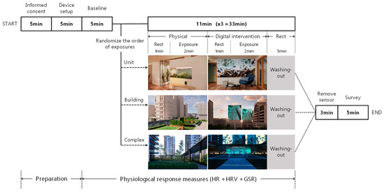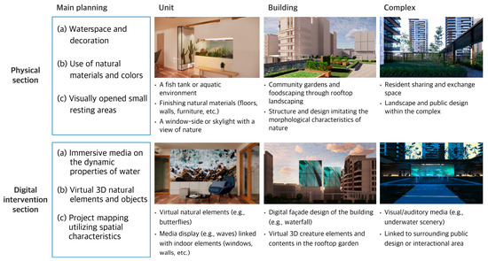 The biophilic residential environment was modeled in SketchUp Pro 2021, and VEs were created as 3D videos using Enscape 3.1. Considering the participants’ housing type, each residential environment was designed to have a familiar structure [35]. The exposure time for each residential scale was set at 4 min, which has been reported to have the most significant effect on stress recovery in biophilic VEs [19,37,38]. The VE videos consist of physical and digital intervention sections. Each planning element was applied complexly according to the residential scales.