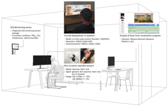 Biophilic VEs were presented to the participants through a high-resolution (3440 × 1440) ultra-wide curved monitor (LG, Seoul, Republic of Korea). External factors like noise and lighting were minimized, and consistent conditions (air quality, temperature, and humidity) were maintained throughout the experiment. Indoor Environmental Quality (IEQ) is a pivotal determinant that can impact the results of seniors’ physiological responses. This was monitored in real-time using an integrated IEQ sensor (LG, Seoul, Republic of Korea), with criteria based on the WHO’s Indoor Air Quality Guidelines [67] and prior studies [31,68] using similar physiological indicators. The measured IEQ data and related criteria from the experiment are outlined in Table A2.