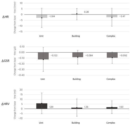 Changes in physiological response according to biophilic residential scales. Notes: Δ(Delta) = changes in physiological measures from baseline; HR = heart rate; GSR = galvanic skin response; HRV = heart rate variability. The error bars depict 95% confidence interval.