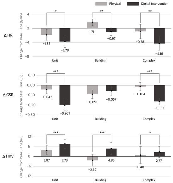 A paired t-test of the physical and digital intervention sections according to the residential scale. Notes: Δ (Delta) = changes in physiological measures from baseline; HR = heart rate; GSR = galvanic skin response; HRV = heart rate variability; * p < 0.05, ** p < 0.01, *** p < 0.000. The error bars depict 95% confidence interval.