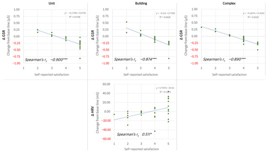 Significant correlation between physiological responses and satisfaction. Notes: Physiological outcomes with the highest correlation coefficients by residential scale are presented. Generated by Spearman’s rank-order correlation and scatter matrix. Δ(Delta) = changes in physiological measures from baseline; GSR = galvanic skin response; HRV = heart rate variability; * p < 0.05, *** p < 0.000.