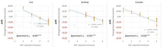 Significant correlation between physiological responses and immersion. Notes: Physiological outcomes with the highest correlation coefficients by residential scale are presented. Generated by Spearman’s rank-order correlation and scatter matrix. Δ (Delta) = changes in physiological measures from baseline; HR = heart rate; *** p < 0.000.