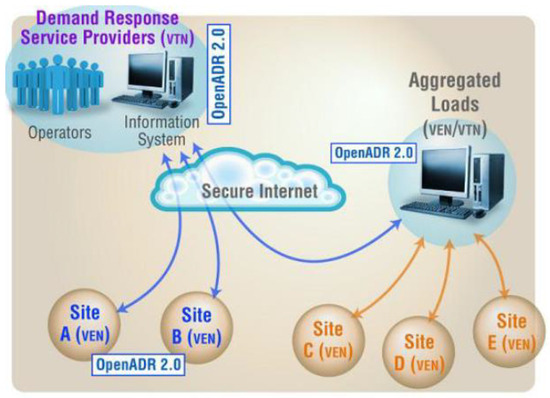 A utility or Independent System Operator (ISO) could send OpenADR commands to any user end site. The OpenADR device of an aggregator could be a VEN in the lower layer of hierarchical architecture to respond to the upper layer VTN server and a VTN in the upper layer to order the lower layer VENs. Figure 2 shows the application of OpenADR, in which a VTN (power company/service provider), with OpenADR protocol, transmits grid information (e.g., price and event) to a VEN in Home and Building Energy Management Systems through the Internet. The VEN then processes the demand control (on/off or adjusting power output) when receiving the event (e.g., unload control).