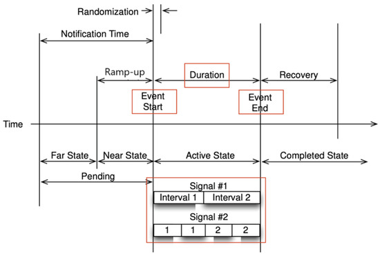 Figure 3 shows a complete OpenADR EiEvent. There is a notification time before the event enters the active state. The duration is used to notify users involved in the demand response program, and the users will shed the load step by step during ramp-up. During the event duration, various types of signals could be dynamically sent according to actual demand requests. Finally, the load would be gradually returned to service during recovery.