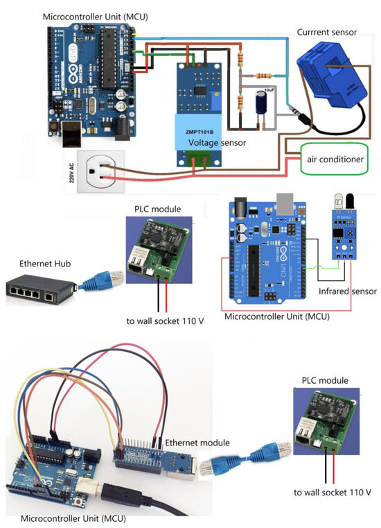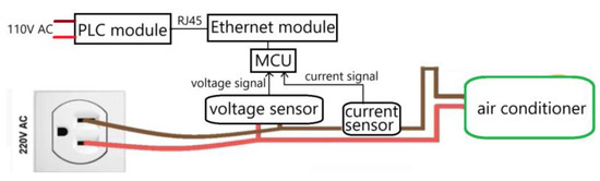 Figure 13 shows the actual demand response controller. The voltage sensor can measure single-phase AC (alternating current) voltage up to 250 V, and the current sensor is a split-core type of noninvasive current transformer that can measure AC current up to 100 A. The MCU used in the voltage/current module can sample 149 points per cycle (one cycle: 16.7 ms for 60 Hz) for both voltage and current and compute the RMS of voltage as per Equation (1), the RMS of current as per Equation (2), and the average value of the instantaneous power (real power) as per Equation (3). These calculated values are then transmitted every cycle to the VEN or server (database) through PLC. The average power per cycle is then used to compute the energy consumption of the load as Equation (4). The data rate of the PLC used in this system is 200 Mbps for powerline and 100 Mbps for Ethernet, using OFDM modulation technology.