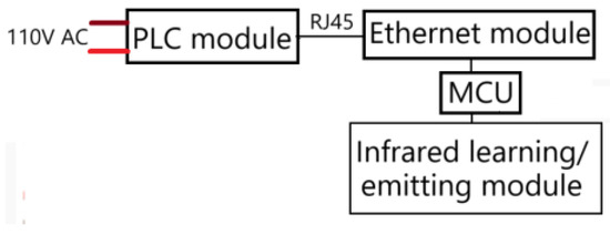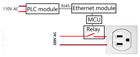 The PLC used in this system complies with HomePlug AV, IEEE802.3, and IEEE802.3u. It transmits and receives Internet data via power lines in the home. Figure 6 shows the architecture diagram of the smart socket, where the MCU can receive commands from the VEN through PLC and control the on/off switch of the AC power socket through the relay. Therefore, the load connected to the smart socket can be shed per the VEN’s request. Figure 7 depicts the architecture diagram of the infrared module, where the MCU can receive the command from the VEN and initiate the infrared remote control. The SD card in this module stores infrared control codes through the infrared learning process. According to the demand control command, the MCU emits the corresponding infrared control code from the SD card.