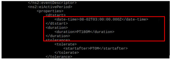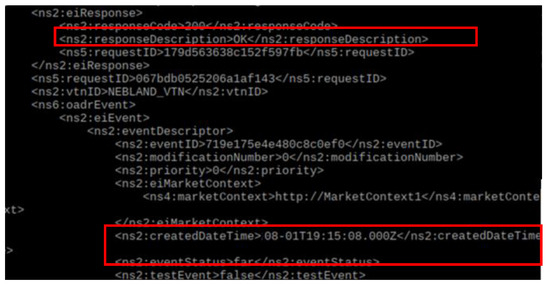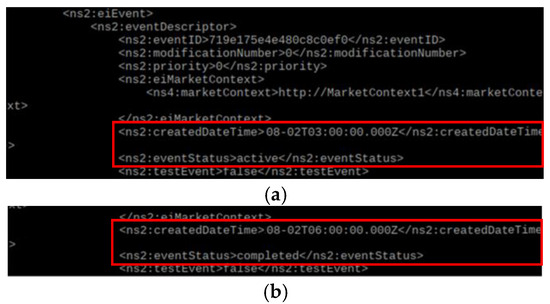 The demand response controller is used as a VEN, through DR Manager, in the OpenADR network to actively inquire about VTN event messages in PULL mode. The VEN sends an OpenADR Request with an XML message including requestID and VEN ID generated with random numbers to the VTN, as shown in Figure 8. Without a demand response event, the Response content replied by VTN contains the corresponding requestID and a responseCode: 200 for success and 4XX for error. Figure 9 shows the ADR event information received by the developed VEN. The event started at 03:00:00 on 2 August, and the duration is 180 min (PT180M). Figure 10 and Figure 11 show that the VEN receives different states of demand response events replied to by the VTN. The major transmitted information is the event’s starting time, date-time, and duration. When the <createdDateTime> in the <eventDescriptor> is before (less than) the <dtstart> in the <eiActivePeriod>, the VEN is in a far state, as shown in Figure 10 where responseCode is 200 and <createdDateTime> is 19:15:08 on 1 August. When the <createdDateTime> is equal to the <dtstart> (in this case, it is 03:00:00, 2 August), the event is induced, and the response state changes into active (Figure 11a). When the event ran for 180 min, at 06:00:00, 2 August, the state was changed into the completed state (Figure 11b).