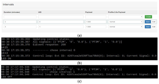 Figure 12a displays the information of OpenADR control signals. In Figure 12a, “Duration” is the signal lasting time, and “UID” is the signal number. Figure 12b,c show the test results of load control, where “All signals” includes all UIDs set in the VTN (in this case, the UIDs are 0 and 1, as shown in Figure 12a). Signal 0 lasts 2 min, and signal 1 lasts 3 min according to the setup in the VTN. When the number after the “chose interval” is the signal number set in the VTN, the corresponding action for the load would be induced (chose interval 0 in Figure 12b: LED ON and chose interval 1 in Figure 12c: LED OFF).