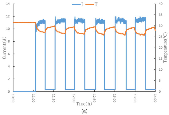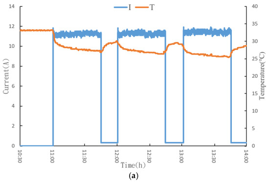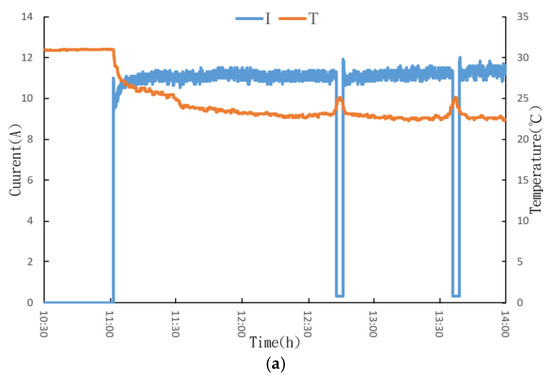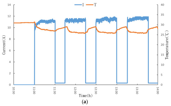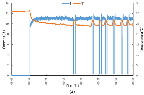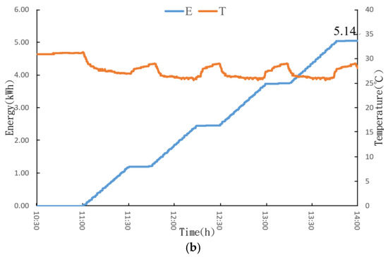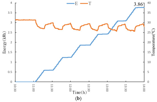 Figure 17a depicts variations of the current of AC and room temperature for Case B. At 11 a.m. on 5 August, the AC was turned on in cooling mode for 30 min and in fanning mode for another 15 min, and this cycle was repeated. The outdoor temperature was 34 °C. During the first cycle, when in cooling mode, the indoor temperature dropped from 31.3 °C to 26.9 °C, and when in fanning mode room, temperature increased from 26.9 °C to 28.8 °C. Afterward, the room temperature varied in the range from 25.8 °C to 28.8 °C. Figure 17b shows this case’s corresponding energy consumption and temperature variations. The total energy consumption is 5.14 kWh.