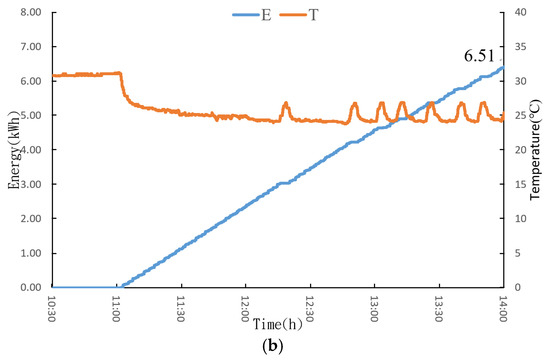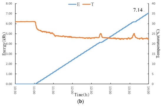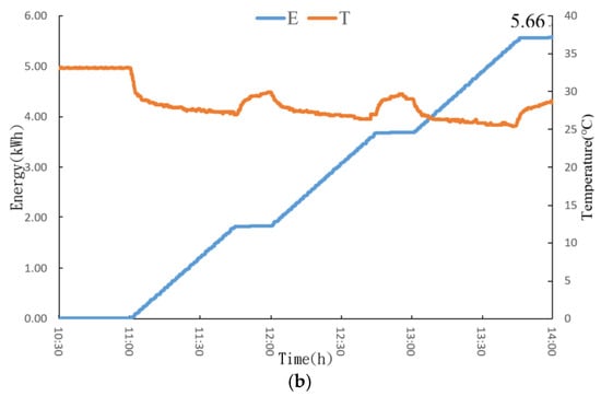 Figure 14a depicts the current (Irms as Equation (2) and labeled as I) of the air conditioner and room temperature (labeled as T) changes for Case 1. At 11 a.m. on 2 August, the AC was turned on and running in cooling mode, the outdoor temperature was 33 °C, the initial indoor temperature was 31.2 °C, and the temperature setting of the AC was 25 °C. The air conditioner’s current began to rise to 11 A, and the indoor temperature began to decrease. When the indoor temperature dropped below the set temperature 25 °C, the air conditioner operated in fanning mode until the indoor temperature exceeded the setting temperature (with some fluctuation due to measurement errors on the temperature sensor). There are two times of fanning modes, and the duration of each fanning mode is short because the indoor temperature increases. Figure 14b shows the corresponding energy consumption (E as Equation (4) and labeled as E) and room temperature (labeled as T) variations for this case. The total energy consumption is 7.14 kWh.