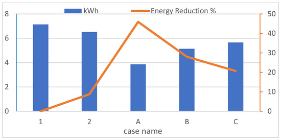 The energy consumption and reduction (%) for all cases are summarized and plotted, respectively, in Table 6 and Figure 19. The energy reduction (%) is defined as per Equation (5). When no ADR program is involved, Case 2 consumes less energy than Case 1 by 8.8% (from 7.04 kWh to 6.41 kWh). Several factors contribute to this reduction. Increasing the AC temperature setting by 1 °C (from 25 °C to 26 °C) could be one major factor and cause significant energy reduction. The other factors are the outdoor and indoor temperatures. The outdoor temperature of Case 1 is higher than that of Case 2 by 1 °C, and the indoor temperature of Case 1 is also higher than that of Case 2. All these factors make the energy consumption of Case 2 lower than that of Case 1 by 8.8%. This result conforms with the statement that increasing the temperature setting of air conditioners by 1 °C would save 6% of power consumption [19].