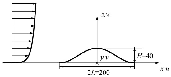 The wind tunnel experiment of the 3D hill was carried out by Takeshi Ishihara et al. [37,38] in 1999, in which a neutrally stratified atmospheric boundary layer was simulated using different scale roughness blocks, and the test section floor was covered with plywood (surface roughness length, z0 = 0.01 mm). The wind speed (Uref) outside of the boundary layer was maintained at 5.8 m/s. The model hill in the wind tunnel was machined from wood with a cross-section of zs(x,y) = Hcos2(π(x2 + y2)1/2/2L), H = 40 mm, and L = 100 mm. Figure 1 shows the details of the hill and coordinate system used in the study, where x, y, and z are the streamwise, spanwise, and vertical directions, respectively.