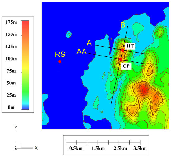The Askervein hill project [39,40], carried out in 1982 and 1983, is a major experimental study of the atmospheric boundary layer at a real atmospheric scale. About 50 anemometer towers (equipped with cup and sonic anemometers) were deployed in this experiment, 30 of which were used to observe the wind flow at a 10 m height, arranged on the A and AA (223°–43°) lines, and the B line (133°–313°) perpendicular to them (see Figure 2). In this paper, the case named “TU-03B”, which has about three hours of wind measurement data, was selected to verify the numerical simulation results. The atmospheric stability in this case is close to neutral, the incoming flow direction (210°, i.e., the x-axis direction shown in Figure 2) is approximately parallel to the A line, and the upstream of the hill is uniformly covered with sparse vegetation and is very flat (z0 = 0.027 m). The wind measurement data at the RS point are generally used as a reference for the inflow during the validation.