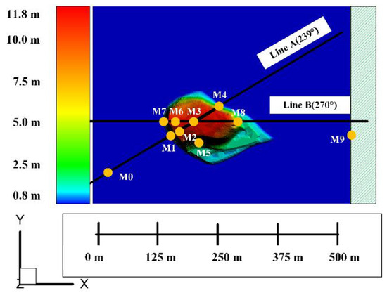 The Bolund island experiment was conducted for three months between 2007 and 2008 [41,42]. There are about 35 anemometers, including 23 sonic and 12 cup anemometers, installed on 10 masts at heights between 2 and 15 m to measure the wind flow. These masts are arranged on lines A and B (see Figure 3). There are four masts along line A (along the x-axis), including M1, M2, M3, and M4, and along line B, which are M7, M6, M3, and M8. The experiment has four experimental conditions, two of which are chosen in this paper, with winds from the west (270°, Case 3) and southwest (239°, Case 4). The reference of the inlet wind speed and turbulent kinetic energy is obtained from M0, a mast without any disturbance. The roughness length on the island is 0.015 m, which is the same as that of the area filled with green lines (x > 327 m), and 0.0003 m over the water surface. The atmospheric stability during the experiments was neutral to slightly stable. The thermal and Coriolis effects are almost negligible due to the small height of the island.