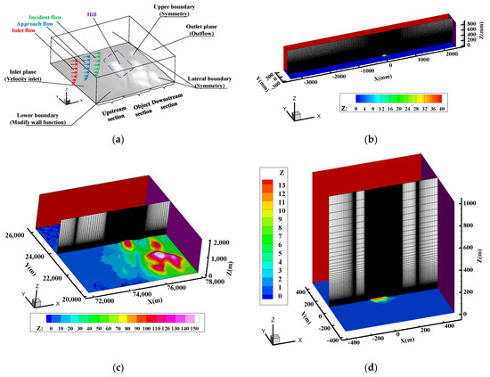 The computational domain and grid used in this paper are shown in Figure 4b–d, where the meshes around the mountain and near the ground need to be refined. In Case 1, the domain size is the same as the wind tunnel (5.8 m (L) × 0.629 m (W) × 0.9 m (H)), the height of the first grid is 0.1 mm, and the minimum horizontal grid size is 0.002 m. In Case 2, the domain size is 6 km (L) × 6 km (W) × 2 km (H), the minimum horizontal cell size is 7 m, and the minimum vertical cell size is 0.24 m. In Case 3, the domain size is 900 m (L) × 800 m (W) × 1000 m (H), the minimum horizontal cell size is 0.3 m, especially near the cliff, and the minimum vertical cell size is 0.12 m. In Case 4, the computational domain and grid scale are the same as in Case 3, and the hill was rotated by a certain angle to make the inlet stream parallel to the inlet plane. For these four cases, we have conducted corresponding grid independence analyses, and the similar grid schemes as mentioned above have been used in analogous studies [5,10].