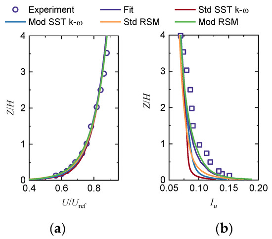 Figure 5 shows the numerical results upstream of the four RANS turbulence models. The mean velocity profiles with different turbulence models are almost the same and are consistent with the inlet conditions. Regarding the turbulence intensity (TI), the TI of the Std SST k-ω model (eTI,in = 19.6%; z/H = 0.5), the Mod SST k-ω model (eTI,in = 11.8%; z/H = 0.5) and Std RSM model (eTI,in = 10.7%; z/H = 0.5) is significantly smaller than the initial given value, especially near the ground; the Mod RSM model (eTI,in = 3.2%, z/H = 0.5) performs the best and has a good agreement with the inlet initial value. From the simulation results, it can be concluded that the inlet conditions based on anisotropic assumptions are more appropriate than those based on isotropic assumptions, and although the modified SST k-ω model outperforms the standard model in terms of the consistency of the inlet profiles, the modified RSM model is more effective.