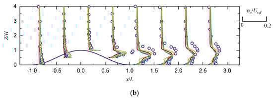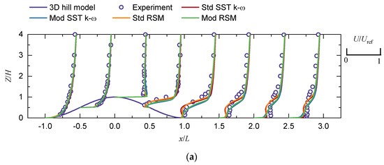 For the wind speed around the hill, it can be seen in Figure 6 that there is no difference between the four RANS models on the windward slope and the hilltop, and that, on the leeward slope and the wake zone of the hill, there is a significant difference between the models, especially at the lower layer (z/H < 2); above this height, there is little difference between the models, and they agree with the experiment. On the leeward slope, the results of the four models are close to the measured data. In the hill wake zone, the wind speed of the Std RSM model and the Std SST k-ω model are smaller than the experimental values (z/H < 0.5). Considering all measurement points, the Mod RSM model and the Mod SST k-ω model best predict the wind speed among the four RANS models. From Figure 7, the Std SST k-ω model and the Mod SST k-ω model perform slightly poorer in wind speed prediction compared to the standard RSM model and the Mod RSM model as the turbulence behind the hill shows anisotropy. The differences in the numerical wind speed of the different models are mainly due to the wind flow separation, which can also be seen in Figure 8, where the results of the Mod RSM model is closer to the experiment.