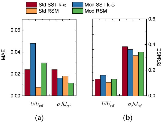 Statistical error of the dimensionless wind speed (U/Uref) and streamwise direction turbulence intensity (σu/Uref) in Figure 6, considering all measurement locations around the hill (about 102 in total) in Case 1. (a) Mean absolute error of U/Uref and σu/Uref; (b) Relative root mean square error of U/Uref and σu/Uref.