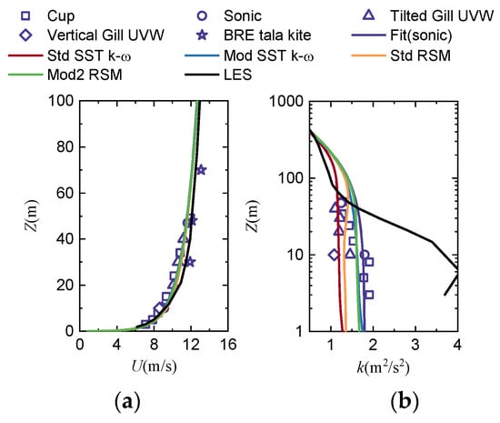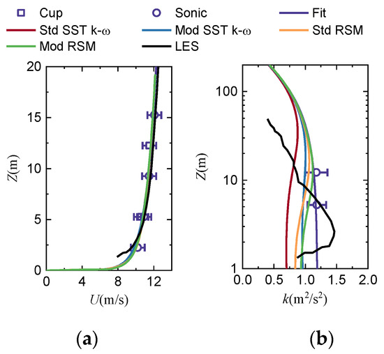 Figure 9 shows numerical results in comparison with the experimental data and the LES results [46]. From Figure 9, it can be seen that the numerical wind speeds of the four RANS turbulence models are generally consistent with the initial values given by the inlet, while the LES results are obviously large above 10 m in height. Regarding the simulation of the TKE, there are obvious differences in the numerical results of the four turbulence models, where the TKE error simulated by the Mod RSM model (eTKE = 8%; z = 10 m) and the Mod SST k-ω (eTKE = 7.8%; z = 10 m) are smaller than that of the standard models (eTKE,Std SST k-ω = 32%; eTKE,Std RSM = 25%; z = 10 m) below the height of 100 m at the RS point.