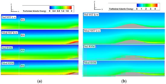 Figure 10a also shows that, near the ground, there is a decay phenomenon of the TKE simulated with the Std RSM model and the Std SST k-ω model from the inlet to the front of the simulated object, while the TKE simulated with the Mod SST k-ω and Mod RSM models is better maintained. This decay of the TKE (the TKE in front of the simulated object is not consistent with the initial value given at the inlet) also affects the simulation of wind flow over the hill, as can be seen in Figure 10b, where the TKE values of the four models differ significantly on the windward and leeward slopes of the hill.
